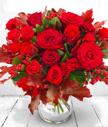 A luscious aquapack handtie of mixed red roses paired with hypericum, the perfect way to show someone you care.