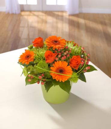 A warm and zesty mix of orange Germini and spray Chrysanthemum circled with delicate Salal. This arrangement is complemented beautifully by its green ceramic pot. Container included. All our flowers are fresh each day so may differ slightly to the images depending on product availability.