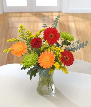 Glowing orange and red Gerbera and red Roses create a warm arrangement to brighten somebody's day. (Image shows 'Regular' option)