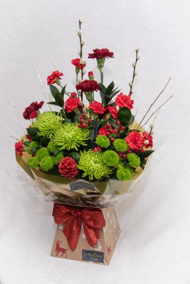 A mix of long lasting flowers in the traditional Christmas colours, red and green. Chrysanthemums and carnations make up the majority of this handtied mixed with hypericum berries, seasonal foliage to complete the look.