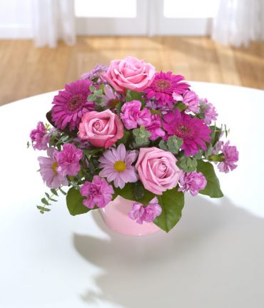 A compact arrangement of mixed pink flowers. Container included. All our flowers are fresh each day so may differ slightly to the images depending on product availability.
