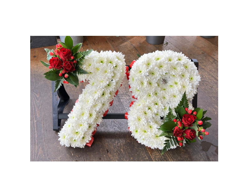 Two numbers created out of the freshest of white chrysanthemums with a spray of flowers to match your choice of colour.