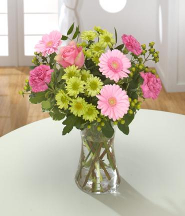 A classic bouquet of pink Roses, Germini and spray Chrysanthemums. Vase not included.