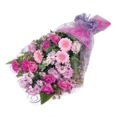 A delightful bouquet in shades of pink, gift wrapped and ready for presentation.