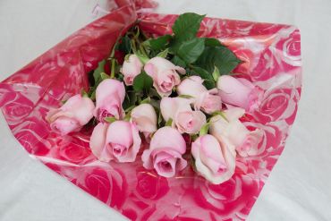 Send your Valentine the bouquet of 12 exquisite pink roses and foliage beautifully presented in cellophane and matching bow. Arranged by our florists at the shop in Salisbury.