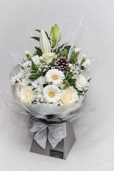 All white and cream flowers, with complementary gift wrapping to complete this frosty-feeling hand-tied. Including roses, chrsyanthemums, gypsophilia, germini, carnations, with seasonal foliage and added festive decorations.