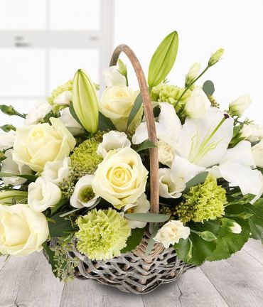 Elegant basket arrangement with white and green flowers, including white lilies and roses. All our flowers are fresh each day so may differ slightly to the images depending on product availability.