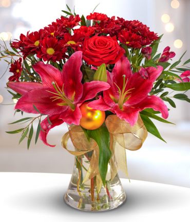 A fantastically festive Christmas bouquet. Red Roses, Chrysanthemums, Carnations, pink Lilies and Alstroemeria with golden baubles.